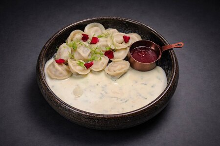Пельмени с олениной (подаются со сливочным и ягодням соусом)
