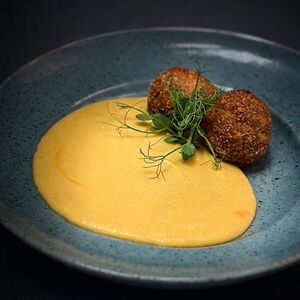 Филе судака (с картофельным пюре на подушке из карамелизированного лука. Подаётся с остро-сладким соусом Sweet Chili)